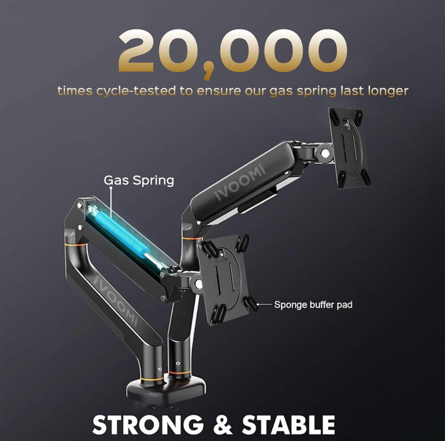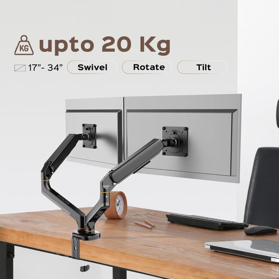 - Supports 15–34″ Monitors up to 20KG: The iVOOMi Power X2 Dual Monitor Arm Stand is built for strength and stability, holding even heavy-duty computer monitors with ease—making it one of the best monitor arm solutions for professionals.