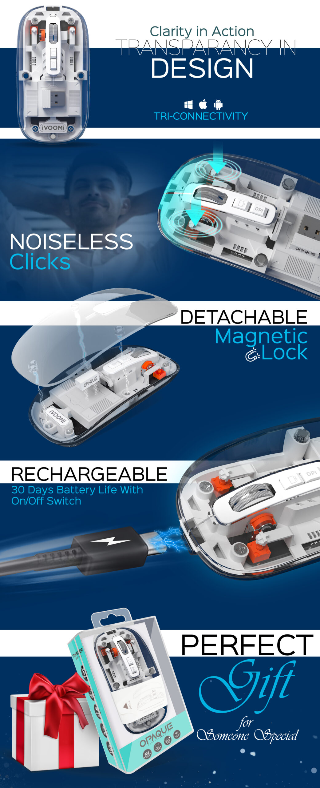 iVOOMi Opaque wireless Mouse | 2.4Ghz+BT5.0 | 1600 DPI | range 15 meter | On/Off switch | Type-C Rechargeable | Longer working time | Nano receiver | Win/ iOS/ Linux/Android | Transparent Design| 1 Year Warranty