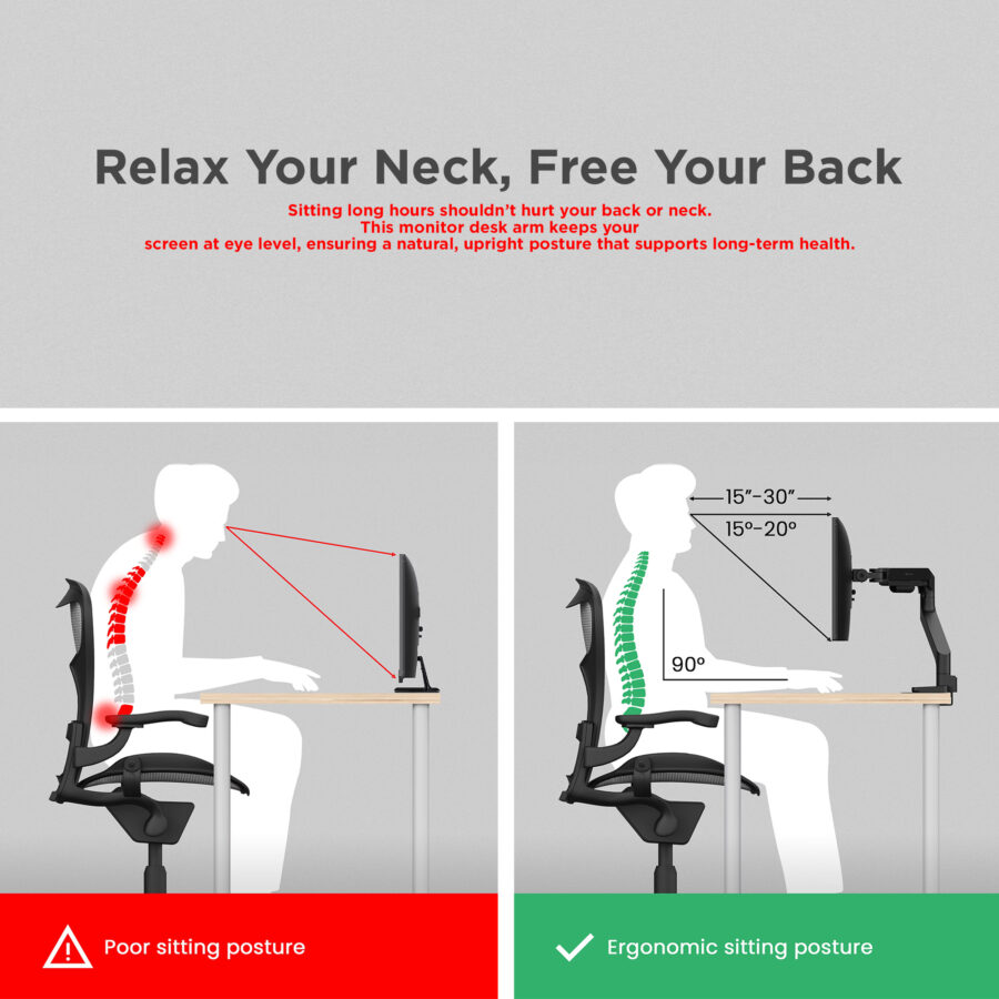 Ergonomic Benefits: Reduces neck, back, and eye strain by positioning the monitor at an optimal height.